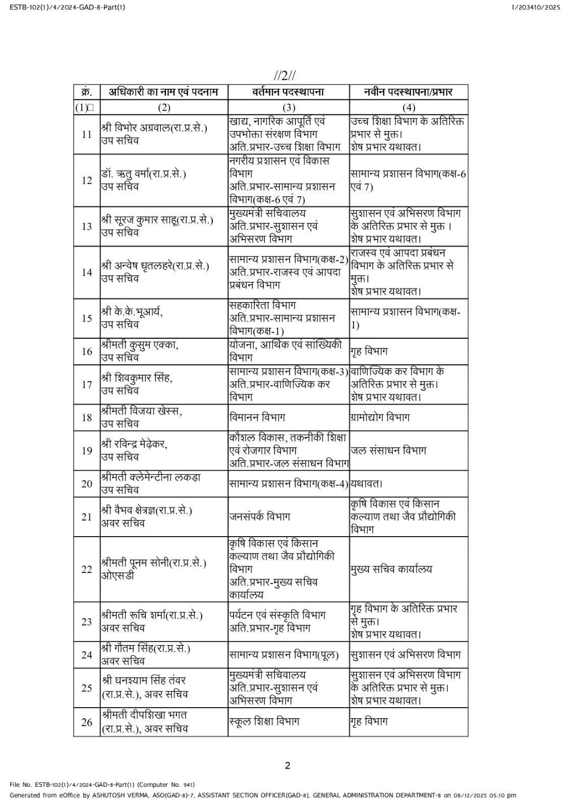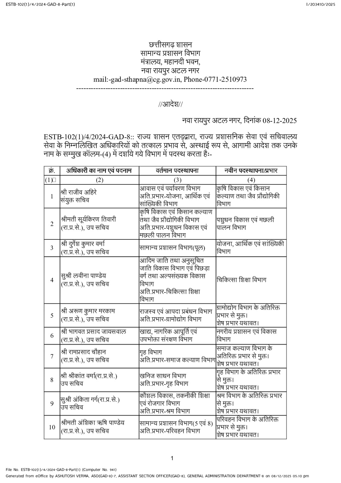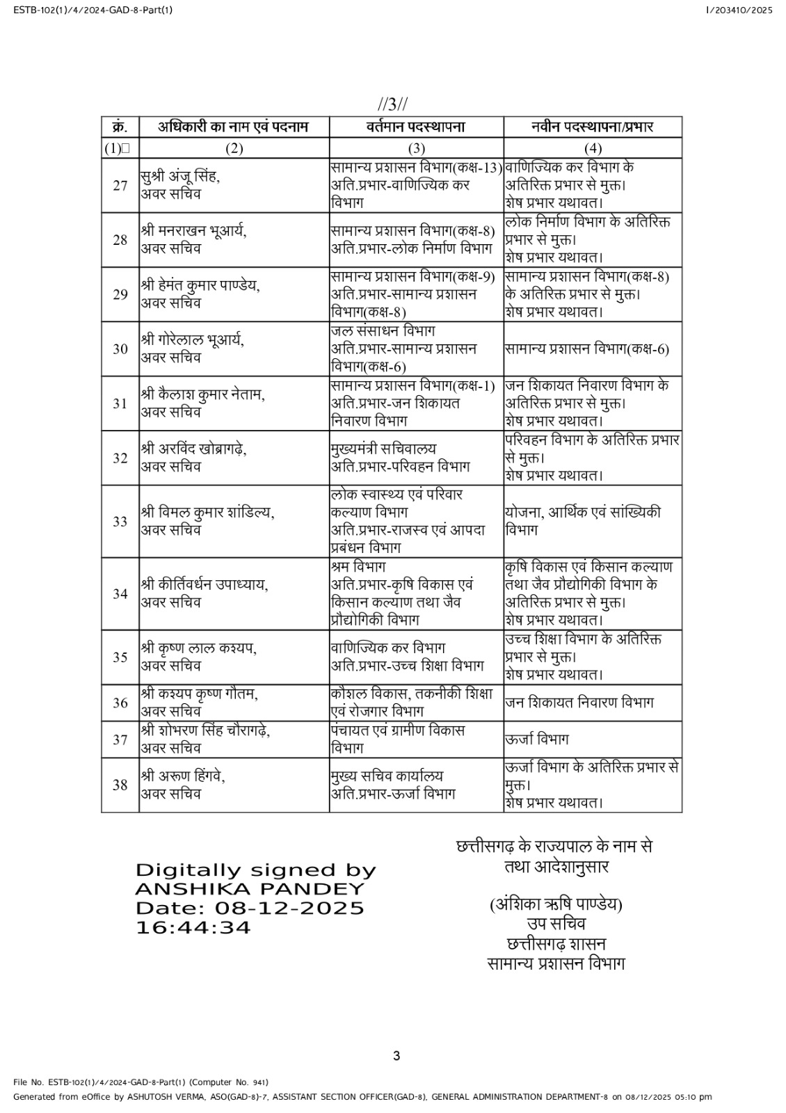 छत्तीसगढ़ में प्रशासनिक फेरबदल, राज्य प्रशासनिक सेवा के 38 अधिकारियों के तबादले