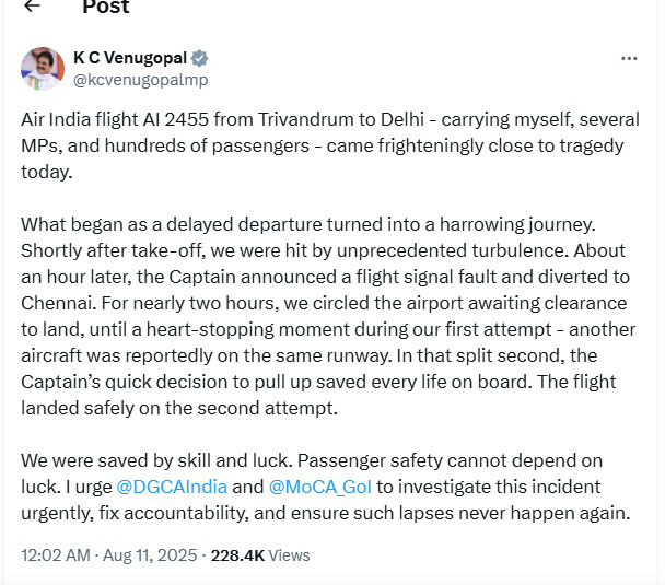 वेणुगोपाल ने कहा, “हम स्किल और किस्मत से बचे, लेकिन सुरक्षा किस्मत पर निर्भर नहीं हो सकती। डीजीसीए और नागरिक उड्डयन मंत्रालय को जांच कर जिम्मेदारी तय करनी चाहिए।