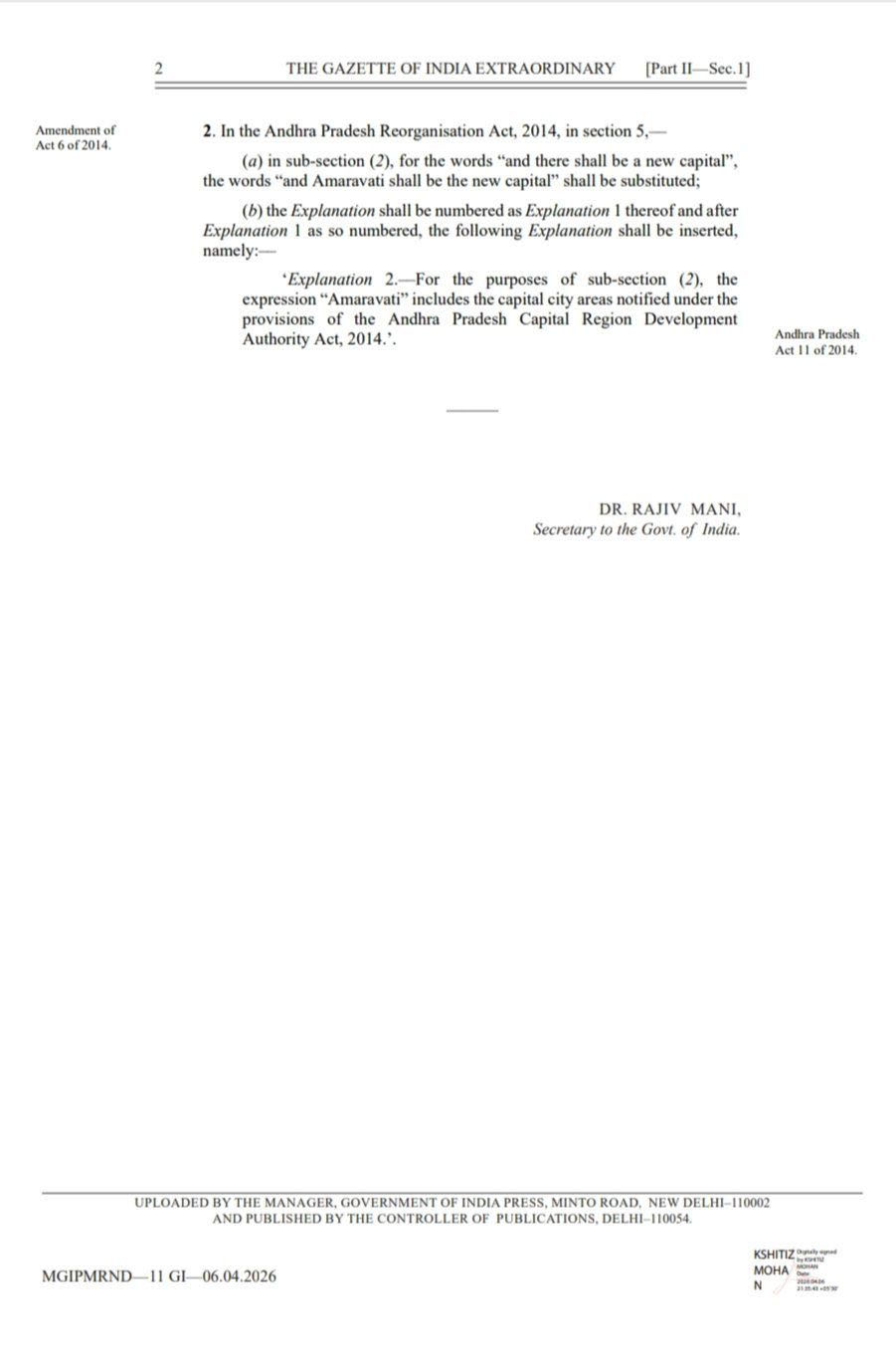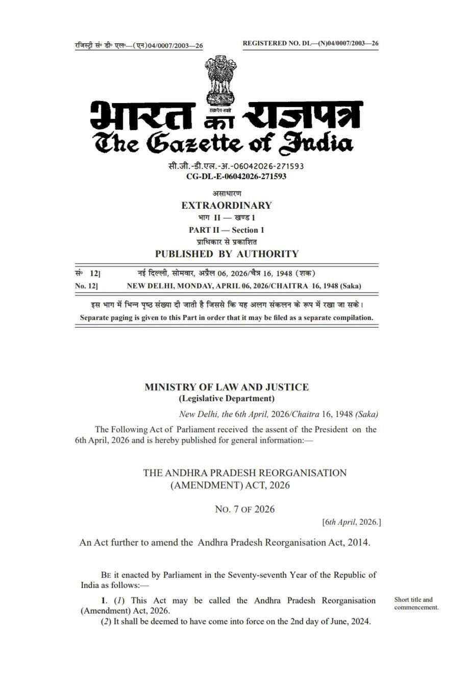 यह फैसला उस समय आया जब राष्ट्रपति द्रौपदी मुर्मू ने आंध्र प्रदेश पुनर्गठन (संशोधन) अधिनियम, 2026 को मंजूरी प्रदान की। इस मंजूरी के साथ ही अमरावती को औपचारिक रूप से कानूनी दर्जा मिल गया, जो राज्य के इतिहास में एक महत्वपूर्ण मील का पत्थर माना जा रहा है।