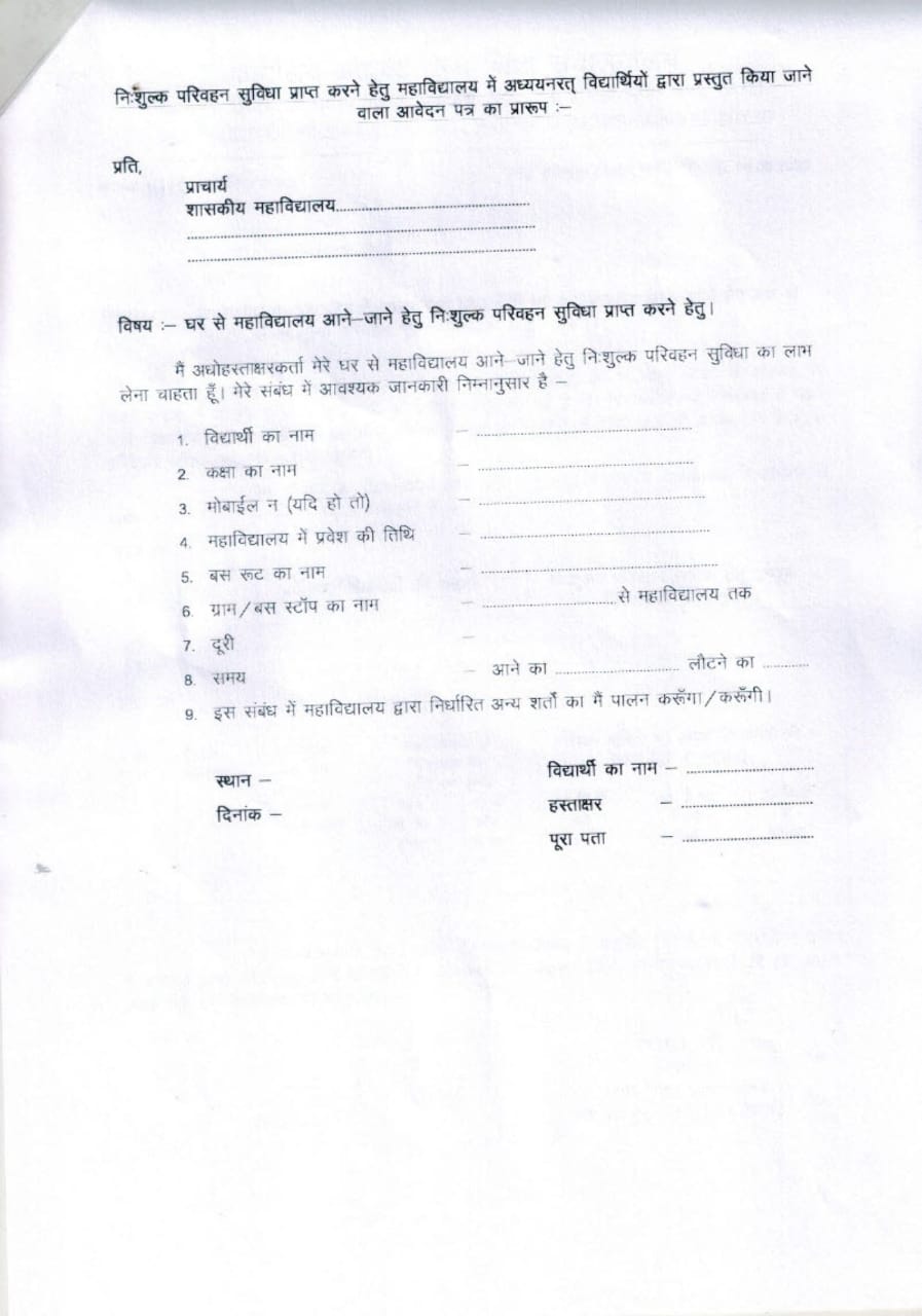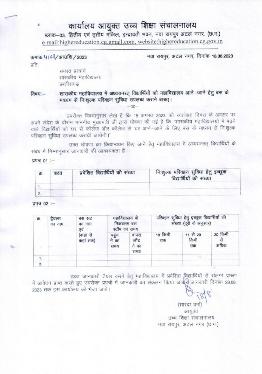 उच्च शिक्षा विभाग की आयुक्त शारदा वर्मा ने इस घोषणा के क्रियान्वयन के संबंध में सभी शासकीय कॉलेज के प्राचार्यों को पत्र लिखा है, जिसमें शासकीय महाविद्यालय में अध्ययनरत उन विद्यार्थियों की जानकारी मांगी गई है, जो निशुल्क बस परिवहन सेवा का लाभ लेना चाहते हैं। पत्र के माध्यम से निर्धारित प्रारूप में जानकारी मांगी गई है। जिसमें ट्रैवलर्स का नाम, बस रूट का नाम, महाविद्यालय के निकटतम बस स्टॉप के नाम और विधार्थी की घर से कॉलेज की दूरी से संबंधित जानकारी मांगी गई है। प्राचार्याें को जानकारी 28 अगस्त तक विभाग भेजने को कहा गया है। बता दें कि युवाओं से भेंट मुलाकात के दौरान कॉलेज के छात्रों ने मुख्यमंत्री भूपेश बघेल से निशुल्क बस सेवा उपलब्ध कराने की मांग की थी। (Announcement of CM Bhupesh)