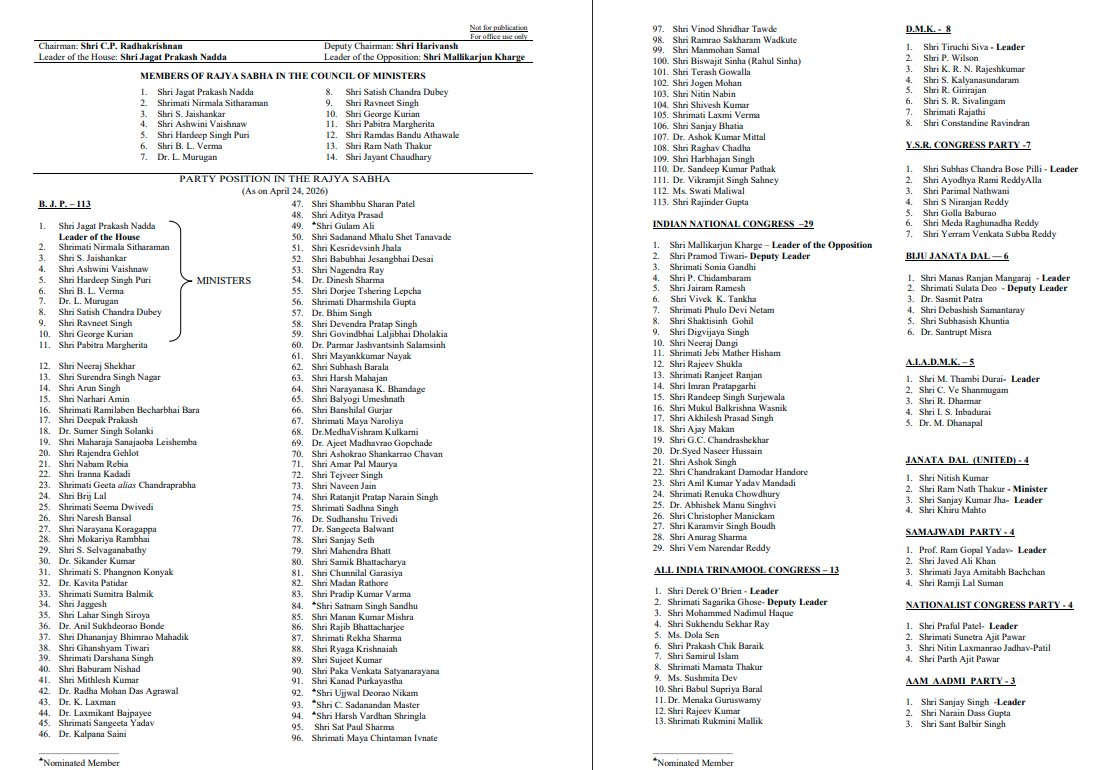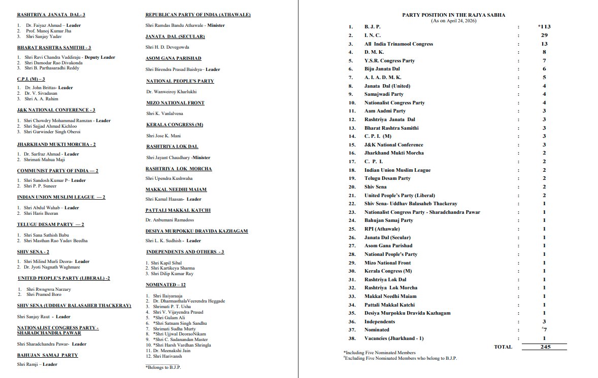 - राज्यसभा में कुल सदस्यों की संख्या- 245