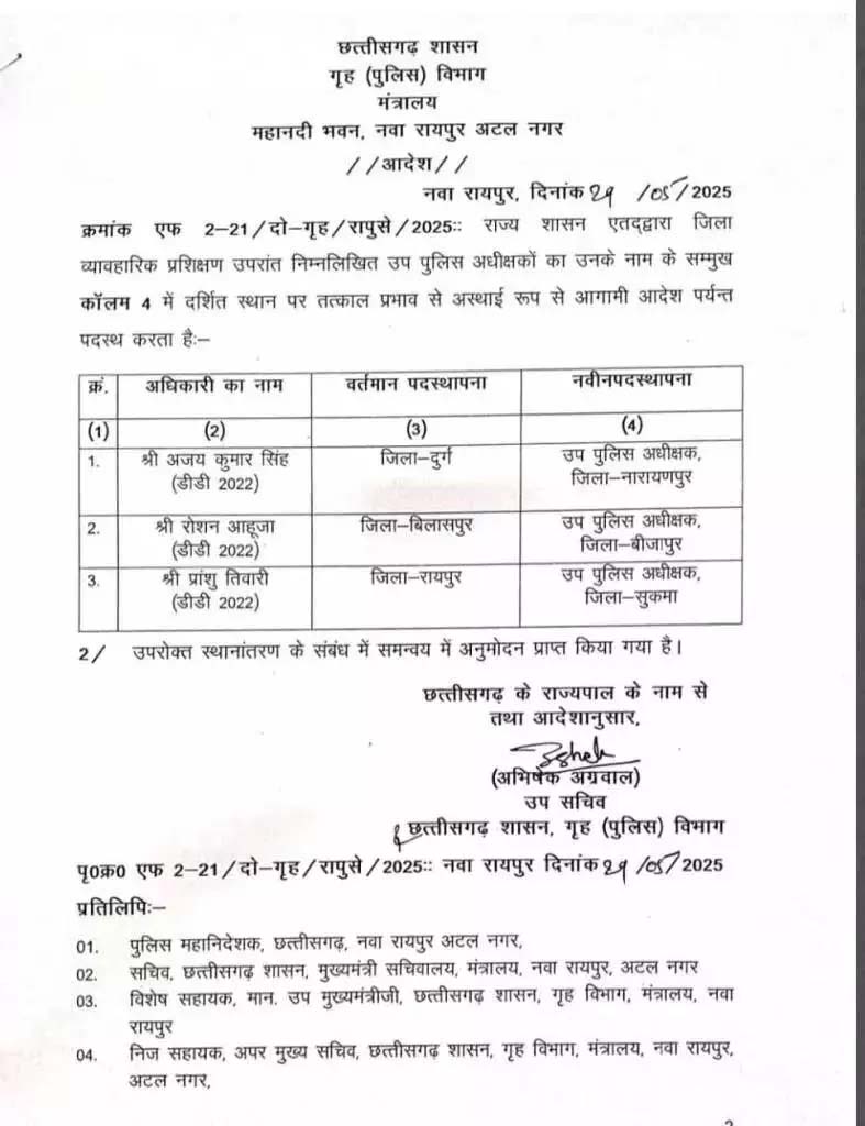 छत्तीसगढ़: 2022 बैच के 3 डीएसपी के तबादले, गृह विभाग ने जारी की सूची