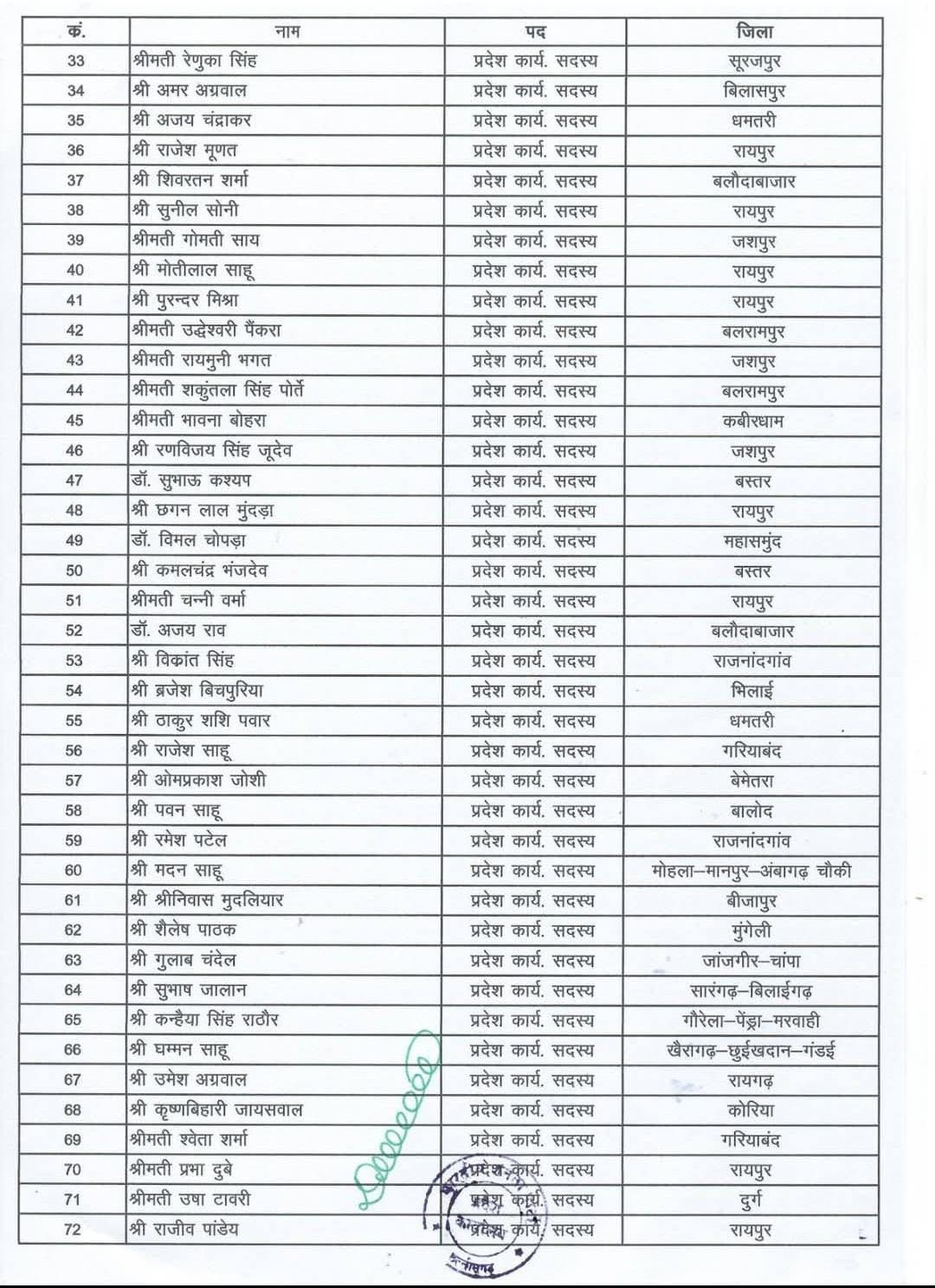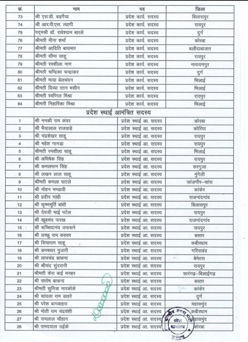 रायपुर। भारतीय जनता पार्टी की छत्तीसगढ़ इकाई ने अपनी नई प्रदेश कार्यसमिति की घोषणा कर दी है। इस कार्यसमिति में मुख्यमंत्री विष्णु देव साय सहित कुल 84 नेताओं को शामिल किया गया है।