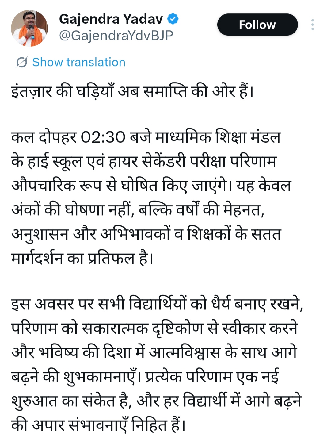 शिक्षा मंत्री गजेंद्र यादव ने छात्रों से अपील की है कि वे धैर्य बनाए रखें और रिजल्ट को सकारात्मक सोच के साथ स्वीकार करें। अच्छे अंक आने पर आगे बढ़ें और उम्मीद से कम परिणाम आने पर निराश न होकर नए अवसरों की तलाश करें। कल दोपहर 2:30 बजे का समय छत्तीसगढ़ के लाखों छात्रों के लिए बेहद अहम है। यह सिर्फ रिजल्ट नहीं, बल्कि उनके भविष्य की नई शुरुआत का संकेत होगा। ऐसे में सभी स्टूडेंट्स से उम्मीद है कि वे परिणाम को सकारात्मक रूप से लें और आत्मविश्वास के साथ अपने अगले कदम की ओर बढ़ें।
