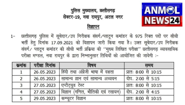 पुलिस मुख्यालय से जारी आदेश के मुताबिक़ 26, 27 और 29 मई को मुख्य लिखित परीक्षा आयोजित होगी. इसके लिए सभी संभाग मुख्यालयों में परीक्षा केंद्र बनाए जाएंगे.