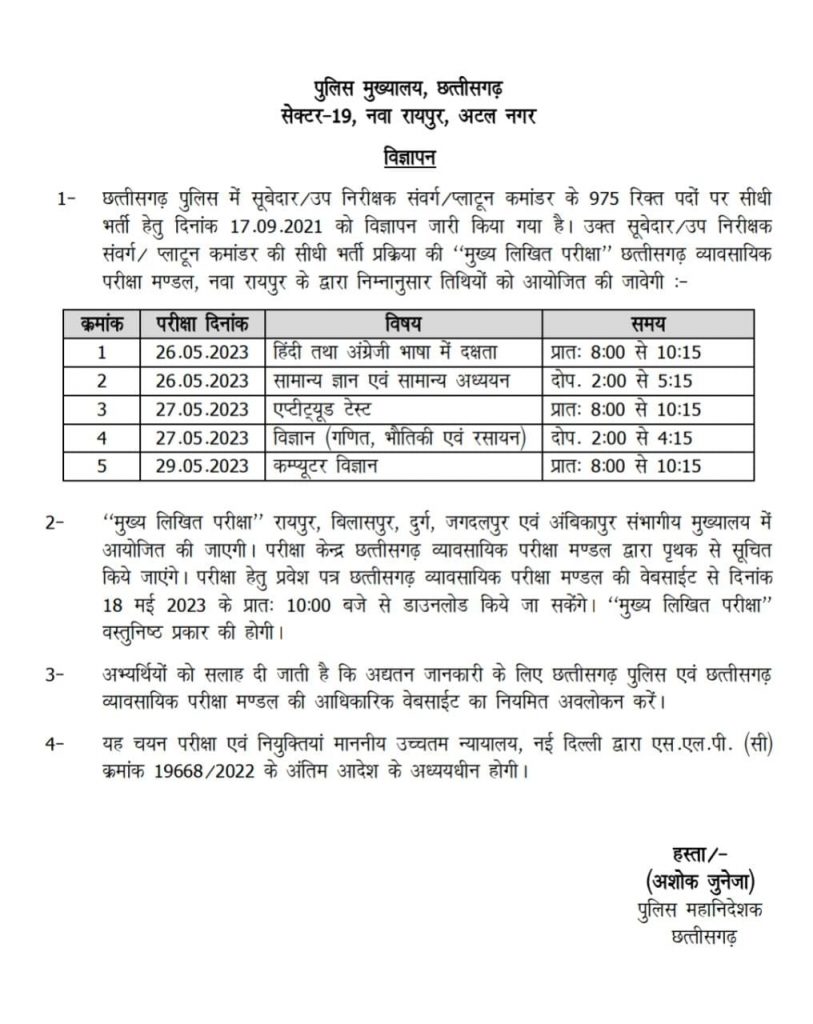 Chhattisgarh Police Recruitment 2023 : छत्तीसगढ़ पुलिस विभाग में सेवा देने की इच्छा रखने वाले युवाओं के लिए खुशखबरी है. अब उनके पुलिस बनने का सपना पूरा होने वाला है. पुलिस मुख्यालय ने सूबेदार, उप निरीक्षक और प्लाटून कमांडर के 975 रिक्त पदों के लिए “मुख्य लिखित परीक्षा” के तारीखों का एलान कर दिया गया है.