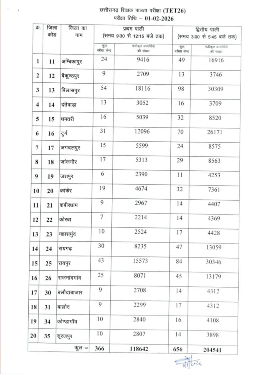 Chhattisgarh TET Exam 2026: छत्तीसगढ़ व्यावसायिक परीक्षा मंडल की ओर से 1 फरवरी को शिक्षक पात्रता परीक्षा (TET 2026) का आयोजन दो पाली में किया जा रहा है, जिसमें 3 लाख से ज्यादा अभ्यर्थी हिस्सा लेंगे। पहली पाली में (प्राथमिक कक्षाओं 1-5 के लिए) में करीब 1.5 लाख अभ्यर्थी और दूसरी पाली (माध्यमिक कक्षाओं 6-8 के लिए) में भी करीब 1.5 लाख अभ्यर्थी शामिल हो रहे हैं। इसके लिए करीब 20 जिला मुख्यालयों में 1 हजार से ज्यादा परीक्षा केंद्र बनाए गए हैं। एडमिट कार्ड पर हर अभ्यर्थी को विशिष्ट केंद्र आवंटित होगा।