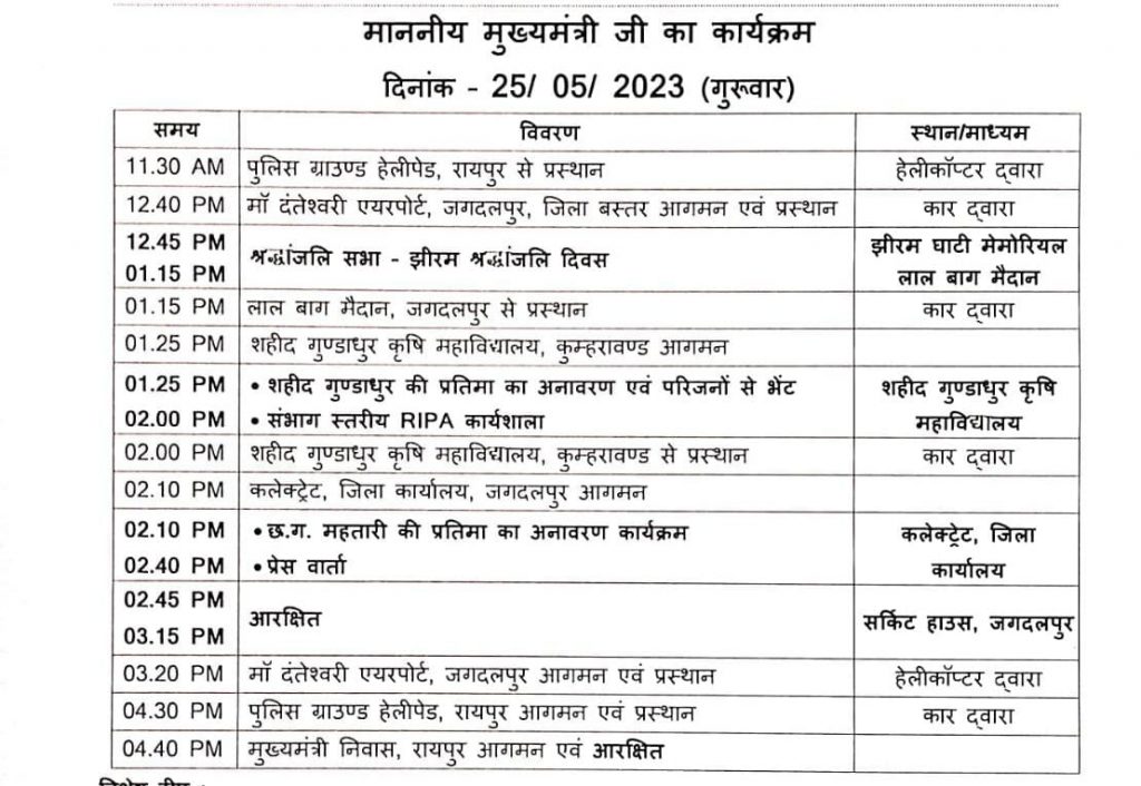 मुख्यमंत्री इसके बाद दोपहर 1.25 बजे शहीद गुण्डाधुर कृषि महाविद्यालय कुम्हरावंड पहुंचेंगे और वहां शहीद गुण्डाधुर की प्रतिमा का अनावरण करने के बाद यहां परिसर में आयोजित ग्रामीण औद्योगिक पार्क की संभाग स्तरीय कार्यशाला में शामिल होंगे। श्री बघेल दोपहर 2.10 बजे जगदलपुर कलेक्टोरेट कार्यालय परिसर पहुंचकर वहां छत्तीसगढ़ महतारी की प्रतिमा का अनावरण करेंगे तथा पत्रकारों से चर्चा करेंगे। मुख्यमंत्री शाम 4.30 बजे रायपुर लौट आएंगे। (Jhiram Ghati Memorial)