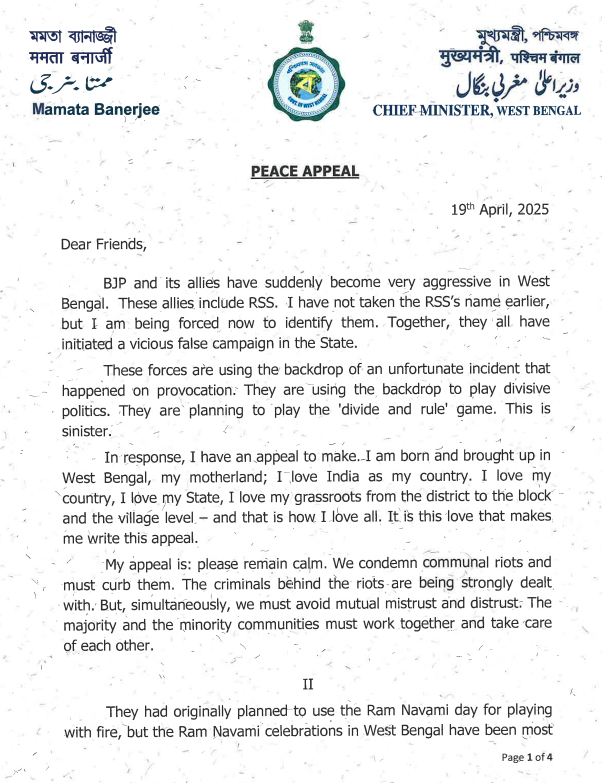 मैं पश्चिम बंगाल में जन्मी और पली-बढ़ी हूं। यह मेरी मातृभूमि है। मैं अपने देश से प्यार करती हूं। मैं अपने राज्य से प्यार करती हूं। मैं जिले से लेकर ब्लॉक और गांव के स्तर तक अपने जमीनी स्तर से प्यार करती हूं और इसी तरह से मैं सभी से प्यार करती हूं। यह प्यार ही है, जो मुझे यह अपील लिखने के लिए प्रेरित करता है। (CM Banerjee on BJP)