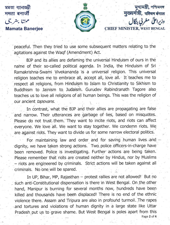 उन्होंने आगे लिखा कि गुरुदेव रवींद्रनाथ टैगोर भी हमें सभी मनुष्यों के सभी धर्मों से प्रेम करना सिखाते हैं। यह हमारे प्राचीन तपोवनों का धर्म था। इसके विपरीत भाजपा और उनके सहयोगी जो प्रचार कर रहे हैं वह झूठ और संकीर्ण है। उनके कथन झूठ का कचरा हैं। गलत उद्धरणों पर आधारित हैं। कृपया उन पर भरोसा न करें। वे दंगे भड़काना चाहते हैं और दंगे सभी को प्रभावित कर सकते हैं। वे हमें संकीर्ण चुनावी राजनीति के लिए बांटना चाहते हैं। कानून व्यवस्था बनाए रखने और मानव जीवन-सम्मान को बचाने के लिए हमने सख्त कदम उठाए हैं। दो थाना प्रभारी हटा दिए गए हैं। पुलिस जांच कर रही है। आगे की कार्रवाई की जा रही है। कृपया याद रखें कि दंगे न तो हिंदू करते हैं और न ही मुसलमान, दंगे अपराधियों द्वारा करवाए जाते हैं। सभी अपराधियों के खिलाफ सख्त कार्रवाई की जाएगी। (CM Banerjee on BJP)