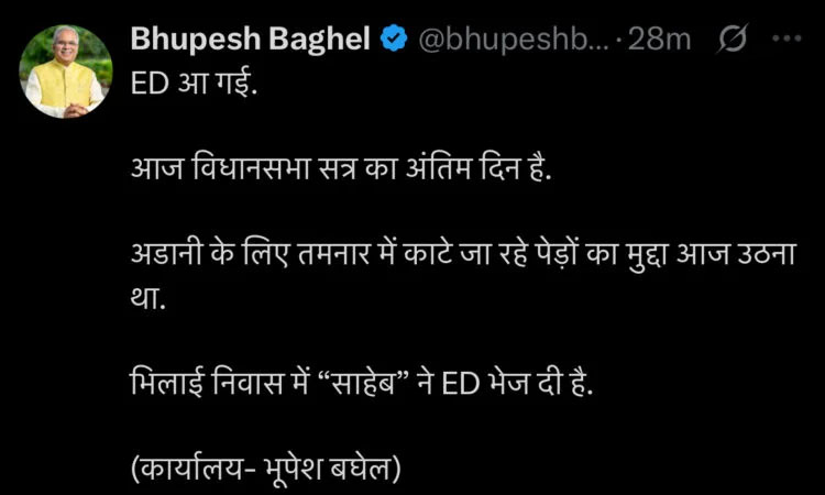 भिलाई। प्रवर्तन निदेशालय (ED) ने आज शुक्रवार सुबह छत्तीसगढ़ के पूर्व मुख्यमंत्री भूपेश बघेल के भिलाई स्थित निवास पर छापेमारी की। टीम सुबह तीन गाड़ियों में CRPF जवानों की सुरक्षा के साथ मौके पर पहुंची और तलाशी की कार्रवाई शुरू की।