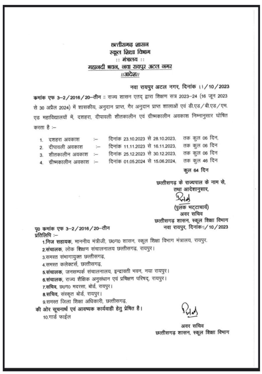 छत्तीसगढ़ के स्कूलों में त्योहारी छुट्टी घोषित, दशहरा और दिवाली के लिए 12 दिन का अवकाश