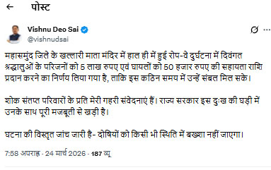 रायपुर : मुख्यमंत्री विष्णु देव साय ने महासमुंद जिले के खल्लारी माता मंदिर में हाल ही में हुई रोप-वे दुर्घटना में प्रभावित परिवारों के लिए सहायता राशि की घोषणा की है। उन्होंने दिवंगत श्रद्धालुओं के परिजनों को 5 लाख रुपए एवं घायलों को 50 हजार रुपए की सहायता राशि प्रदान करने का निर्णय लिया है, ताकि इस कठिन समय में उन्हें संबल मिल सके।
