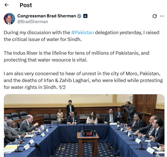 एक्स पर एक पोस्ट में, शेरमैन ने लिखा कि उन्होंने “पाकिस्तानी प्रतिनिधिमंडल को आतंकवाद और विशेष रूप से जैश-ए-मोहम्मद समूह से लड़ने और उसके खात्मे की बात कही, जिस आतंकी समूह ने साल 2002 में मेरे निर्वाचन क्षेत्र के डेनियल पर्ल की हत्या की थी।”