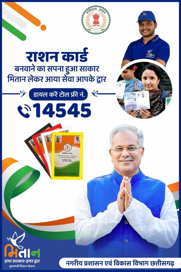 Mitan Yojana : मुख्यमंत्री भूपेश बघेल के निर्देश पर मितान योजना की सेवाओं का विस्तार किया गया है। मुख्यमंत्री भूपेश बघेल ने ट्वीट कर इसकी जानकारी दी है। इसके तहत अब घर बैठे बनवाए राशन-कार्ड जा सकेंगे। राशन-कार्ड बनवाने के लिए टोल फ्री नंबर 14545 पर डायल करना होगा। नागरिक सुविधाओं में लगातार बढ़ोतरी हो रही है। बतादें कि मितान योजना के तहत शासकीय योजनाओं का लाभ लोगों को घर बैठे ही मिल रहा है। (Mitan Yojana )