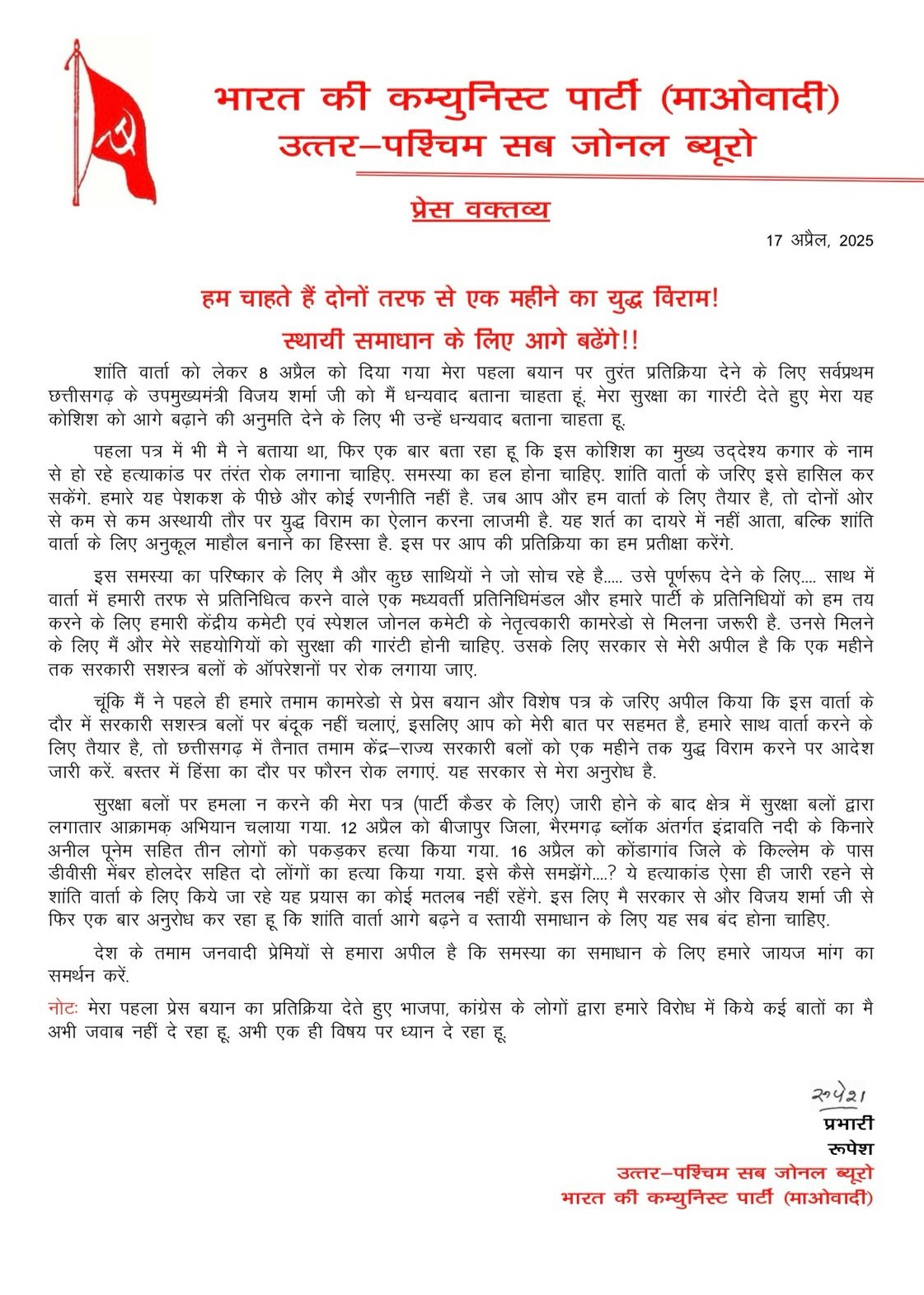 रूपेश ने कहा कि सुरक्षा की गारंटी के लिए सरकार से मेरी अपील है कि एक महीने तक सरकारी सशस्त्र बलों के ऑपरेशनों पर रोक लगाया जाए। मैंने पहले ही हमारे तमाम कामरेडो से प्रेस बयान और विशेष पत्र के जरिए अपील किया कि इस वार्ता के दौर में सरकारी सशस्त्र बलों पर बंदूक नहीं चलाएं। इसलिए आप अगर मेरी बात पर सहमत है तो हम वार्ता करने के लिए तैयार है। इसके लिए छत्तीसगढ़ में तैनात तमाम केंद्र, राज्य, सरकारी बलों को एक महीने तक युद्ध विराम करने के लिए आदेश जारी करें। बस्तर में हिंसा पर फौरन रोक लगाएं। यह सरकार से मेरा अनुरोध है। सुरक्षाबलों पर हमला न करने का मेरा पत्र पार्टी कैडर के लिए जारी होने के बाद क्षेत्र में सुरक्षाबलों द्वारा लगातार आक्रामक अभियान चलाया गया। (Naxalites Demand in Chhattisgarh)