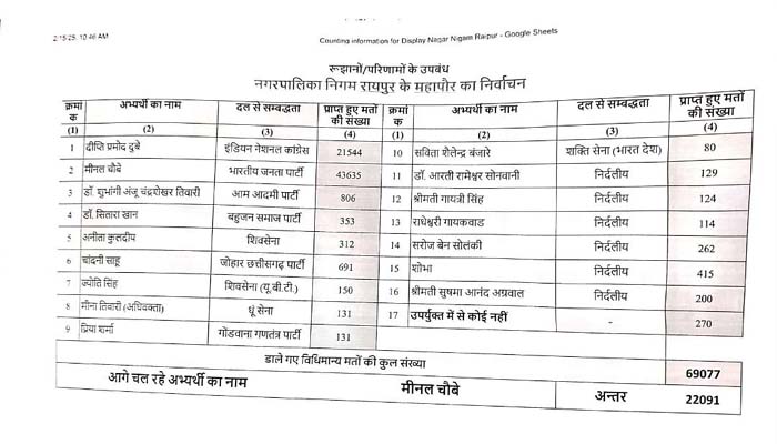 रायपुर नगर निगम मतगणना की द्वितीय चरण के बाद अद्यतन स्थिति