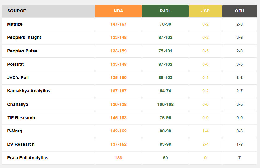 राज्य की 243 विधानसभा सीटों पर मतदान 6 और 11 नवंबर को दो चरणों में संपन्न हुआ। वोटिंग के बाद सामने आए 11 एजेंसियों के एग्जिट पोल के नतीजे बताते हैं कि नीतीश कुमार की लोकप्रियता अब भी कायम है। MATRIZE–IANS के सर्वे के अनुसार एनडीए को 147–167 सीटें, महागठबंधन को 70–90 सीटें, जबकि अन्य को 2–6 सीटें मिलने का अनुमान है।