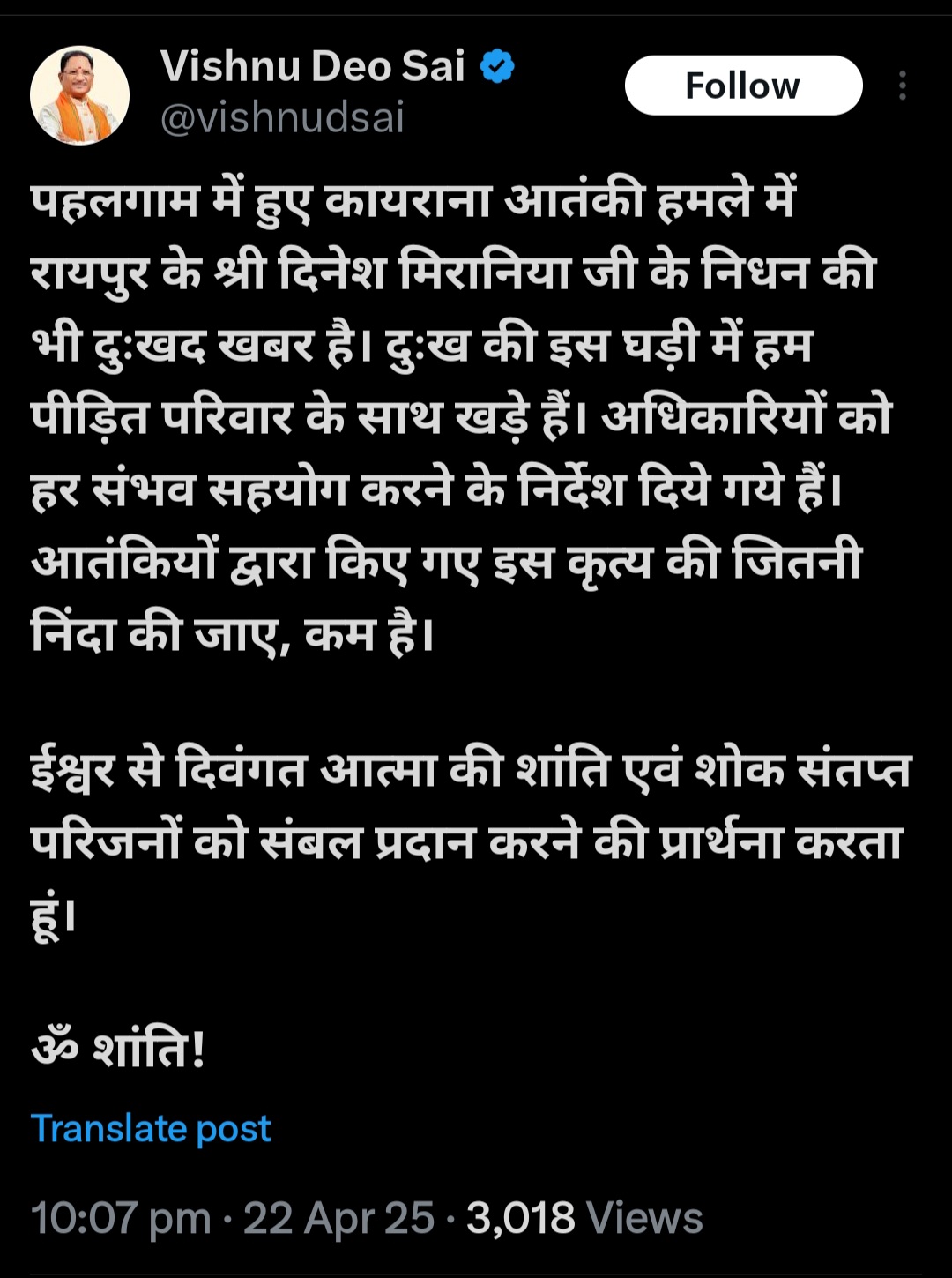छत्तीसगढ़ के मुख्यमंत्री विष्णु देव साय ने एक्स पर लिखा, जम्मू-कश्मीर के पहलगाम में पर्यटकों पर कायर आतंकियों ने हमला किया है। पहलगाम में हुए कायराना आतंकी हमले में रायपुर के श्री दिनेश मिरानिया जी के निधन की भी दुःखद खबर है। दुःख की इस घड़ी में हम पीड़ित परिवार के साथ खड़े हैं। अधिकारियों को हर संभव सहयोग करने के निर्देश दिये गये हैं। आतंकियों द्वारा किए गए इस कृत्य की जितनी निंदा की जाए, कम है।