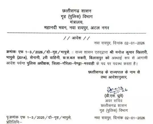 जारी आदेश के अनुसार मनोज कुमार खिलाड़ी को तत्काल प्रभाव से पेंड्रा मरवाही जिले की पुलिस व्यवस्था की जिम्मेदारी सौंपी गई है। उनके पदभार ग्रहण करने के साथ ही जिले में पुलिस प्रशासन में बदलाव लागू हो जाएगा।