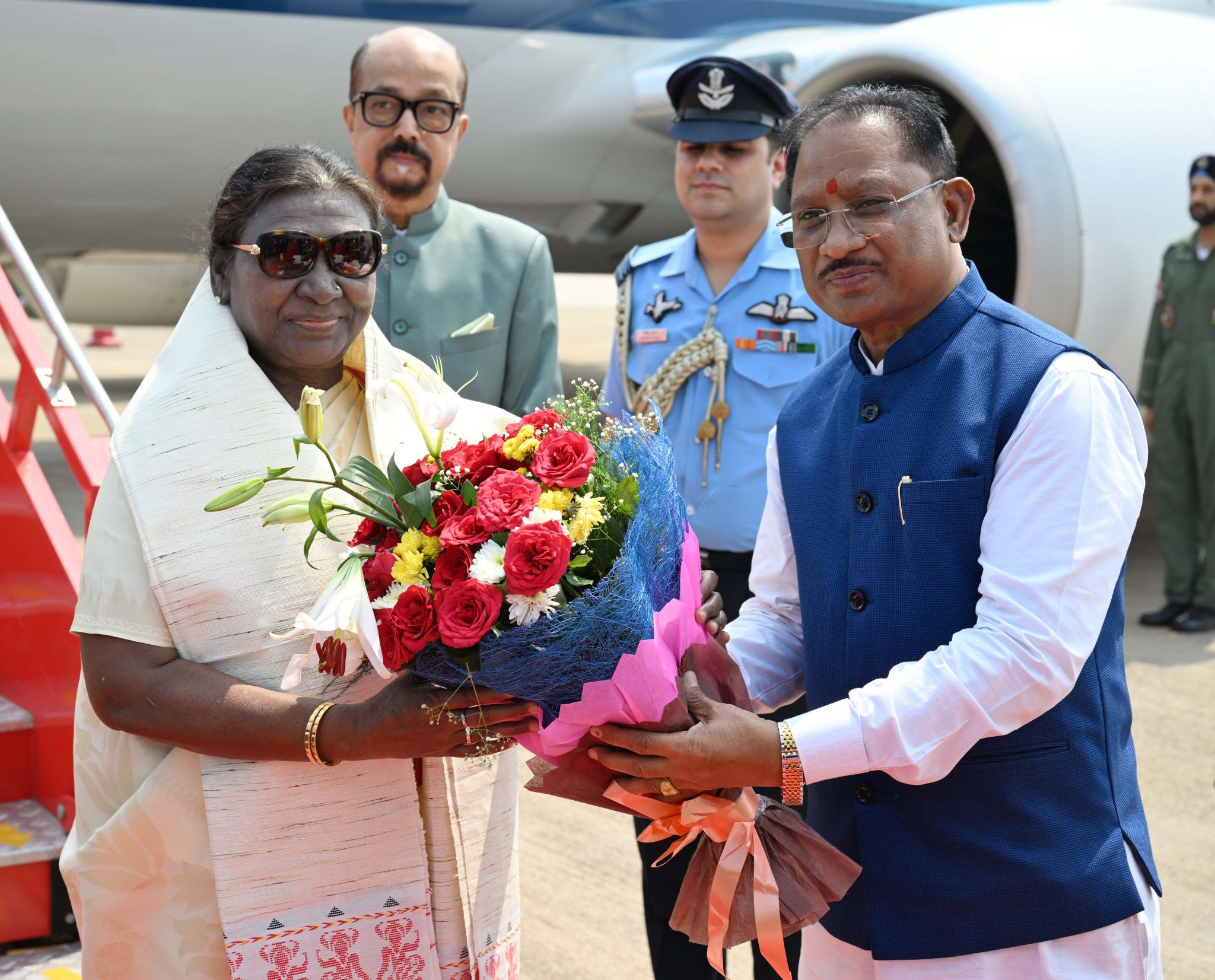 President Murmu in Raipur: राष्ट्रपति द्रौपदी मुर्मू रायपुर के स्वामी विवेकानंद एयरपोर्ट पहुंची, जहां राज्यपाल रमेन डेका, मुख्यमंत्री विष्णुदेव साय, केंद्रीय राज्य मंत्री तोखन साहू, डिप्टी CM अरुण साव और विजय शर्मा, महापौर मीनल चौबे, पूर्व राज्यपाल रमेश बैस, सरोज पांडे, गौरीशंकर अग्रवाल, शिवरतन शर्मा समेत कई जनप्रतिनिधियों और अधिकारियों ने उनका स्वागत किया। इसके बाद राष्ट्रपति द्रौपदी मुर्मू ने छत्तीसगढ़ विधानसभा पहुंची, जहां उनका शॉल और प्रतीक चिन्ह भेंटकर अभिनंदन किया गया। इस दौरान राष्ट्रपति, राज्यपाल, मुख्यमंत्री और विधानसभा अध्यक्ष ने विधानसभा की पत्रिका का विमोचन किया।