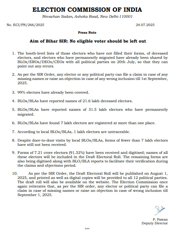 - चुनाव आयोग के अनुसार 7.21 करोड़ वोटरों में से 99% ने फॉर्म जमा किया है।