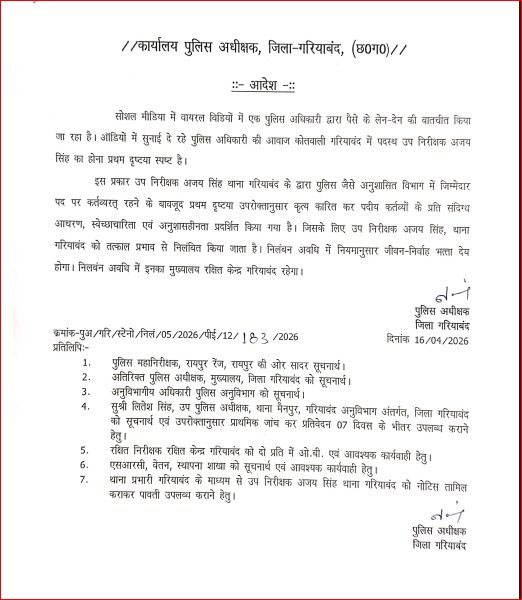 गरियाबंद। सिटी कोतवाली में तैनात उप निरीक्षक अजय कुमार सिंह पर रिश्वत लेकर मामला दबाने का गंभीर आरोप सामने आते ही पुलिस महकमे में हड़कंप मच गया है। सोशल मीडिया पर वायरल हुए दो ऑडियो ने पूरे मामले को सुर्खियों में ला दिया है। मामले की गंभीरता को देखते हुए पुलिस अधीक्षक नीरज चंद्राकर ने तत्काल कार्रवाई करते हुए उप निरीक्षक को निलंबित कर दिया।