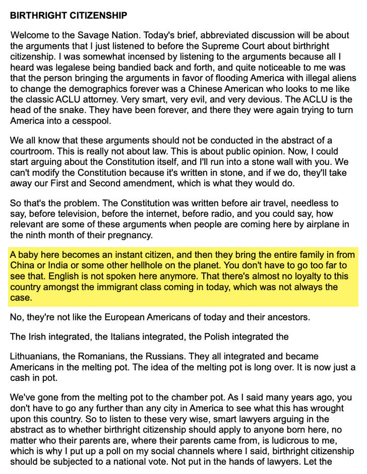 चिट्ठी में कैलिफोर्निया के टेक सेक्टर का जिक्र करते हुए दावा किया गया है कि वहां भारत और चीन के लोगों का प्रभाव ज्यादा है। सैवेज के मुताबिक भर्ती प्रक्रिया में योग्यता से ज्यादा राष्ट्रीयता को महत्व दिया जा रहा है, जिससे अन्य लोगों के लिए अवसर कम हो रहे हैं। हालांकि इस तरह के दावों की स्वतंत्र पुष्टि नहीं हुई है और विशेषज्ञ इसे एकतरफा दृष्टिकोण मानते हैं। सैवेज ने अमेरिकन सिविल लिबर्टीज यूनियन (ACLU) जैसे संगठनों की भी आलोचना की है। उन्होंने आरोप लगाया कि ये संगठन अवैध प्रवासियों के पक्ष में नीतियों का समर्थन करते हैं। इसके साथ ही प्रवासियों पर स्वास्थ्य सेवाओं और सरकारी सुविधाओं के अधिक उपयोग तथा वेलफेयर स्कीम में कथित दुरुपयोग के आरोप भी लगाए गए हैं।